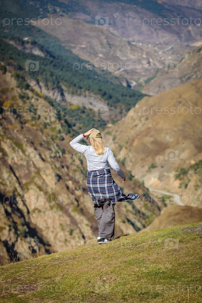 Милая девушка наслаждается величием горного пейзажа, ощущая всю красоту окружающей природы