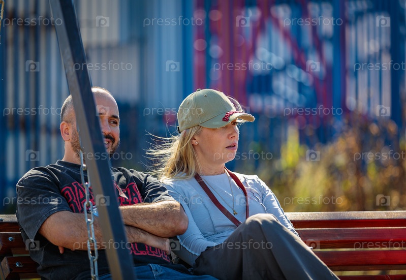Веселая компания болтает, покачиваясь на качелях в парке