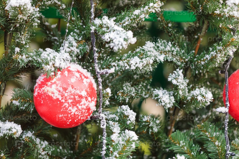 Заснеженные еловые ветки, украшенные новогодним шаром, создают в зимнем лесу уютное и праздничное настроение