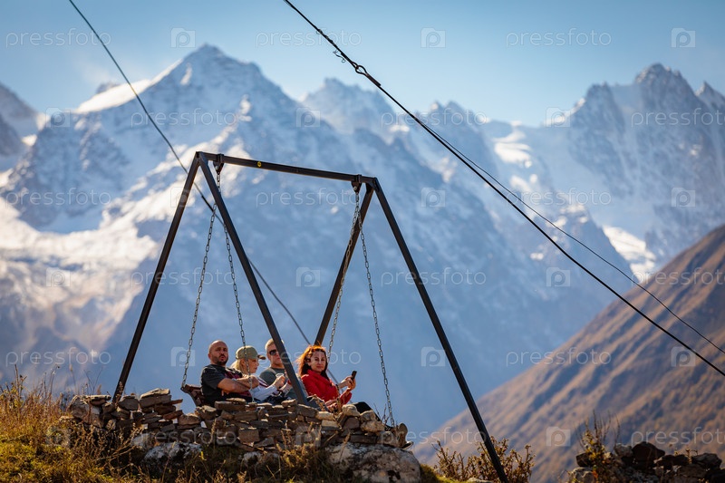 Веселая компания друзей обсуждает планы, наслаждаясь видом на величественные горы