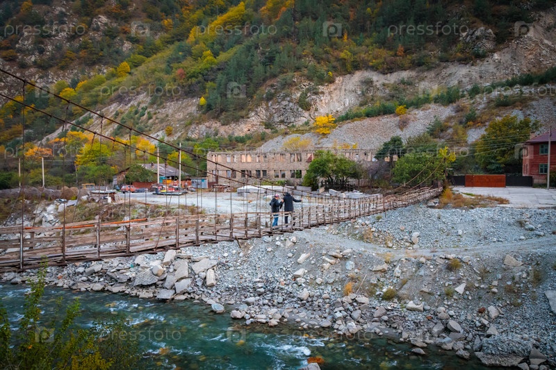 Мужчины идут по подвесному мосту через реку
