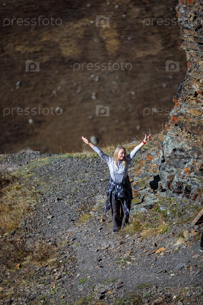 Счастливая девушка стоит на вершине горы, наслаждаясь видом, раскинув руки в стороны