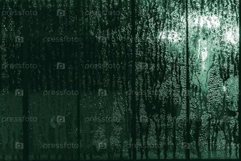 Свет сквозь капли дождя на стекле, абстрактный фон городской улицы в боке