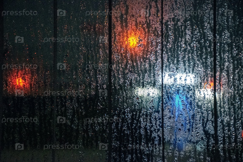 Свет сквозь капли дождя на стекле, абстрактный фон городской улицы в боке