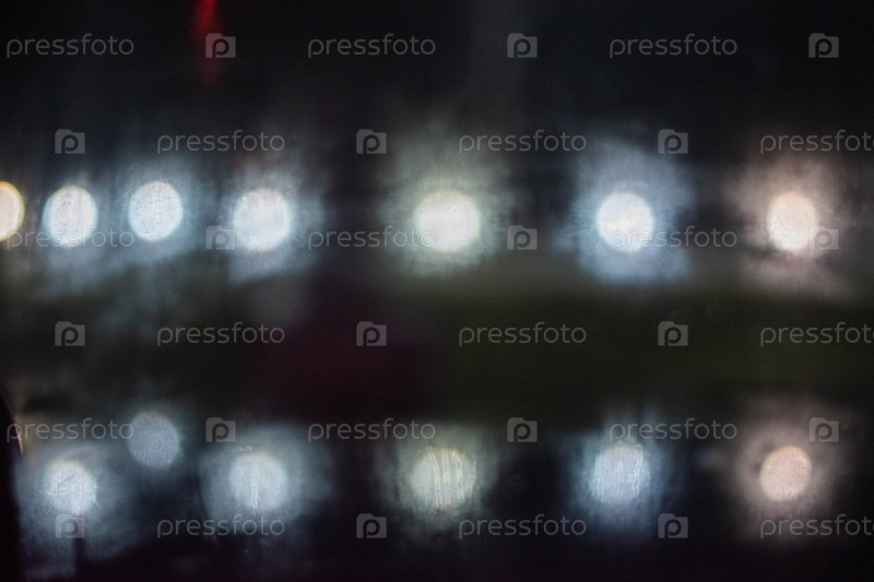 Яркие огни ночного города, сквозь стекло автомобиля из-за преломления света и тумана
