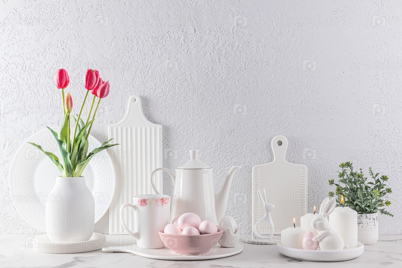 Красивый натюрморт к празднику Пасхи. белая посуда, ваза с тюльпанами, крашеные яйца, пасхальные свечи и зайчики. Кухня праздничный фон