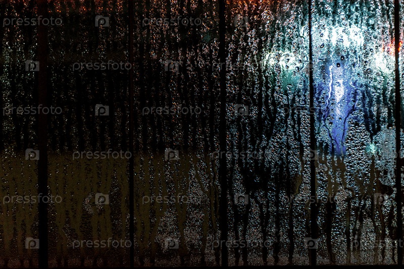 Свет сквозь капли дождя на стекле, абстрактный фон городской улицы в боке