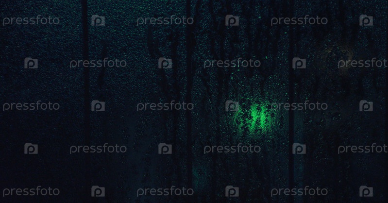 Свет сквозь капли дождя на стекле, абстрактный фон городской улицы в боке