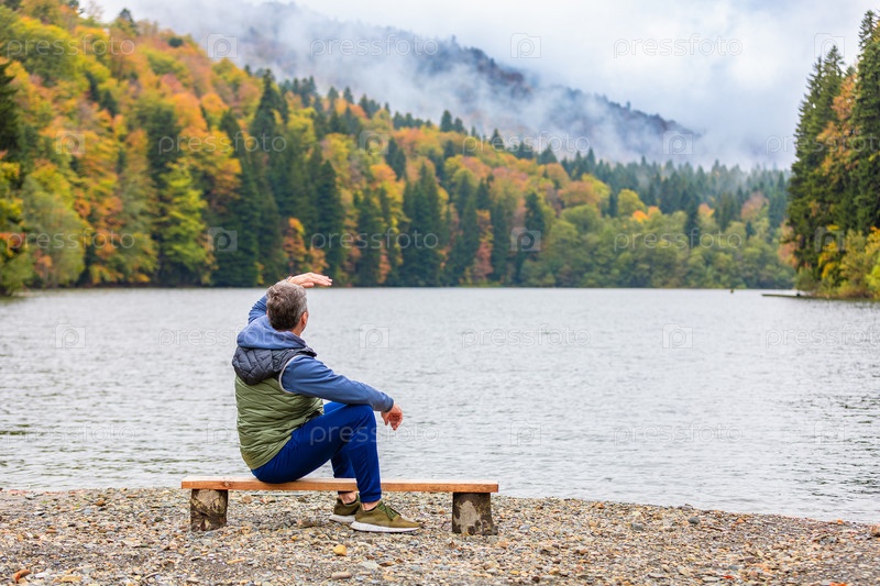 Мужчина созерцает красоту природы у озера в горах, погружаясь в спокойствие и прекрасный вид горного пейзажа