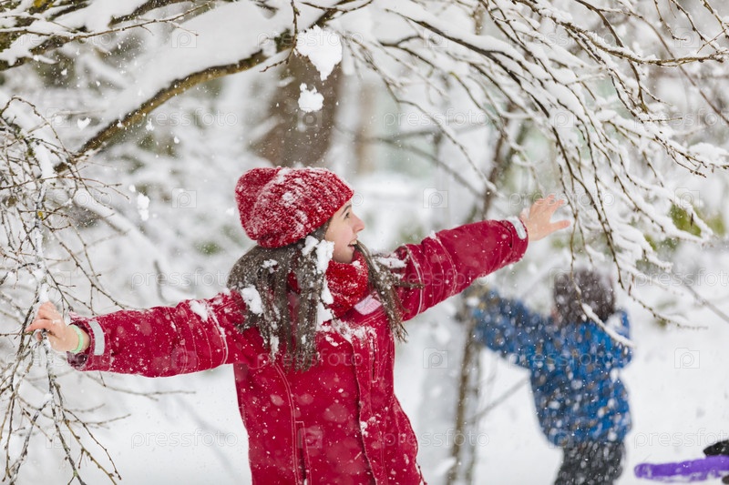 Счастливая девушка в красном комбинезоне сбивает ветки снегом и смеется