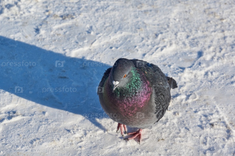 Голуби в поисках еды гуляют по заснеженной городской площади