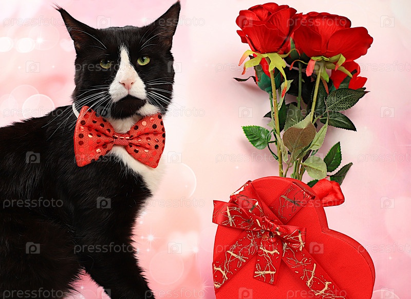 Празднование Дня святого Валентина или Женского дня, Дня матери, баннера. Кот Мейн-Кун поздравляет вас с праздником на фоне букета роз, концепция праздника, дня рождения, свадьбы, выборочный фокус