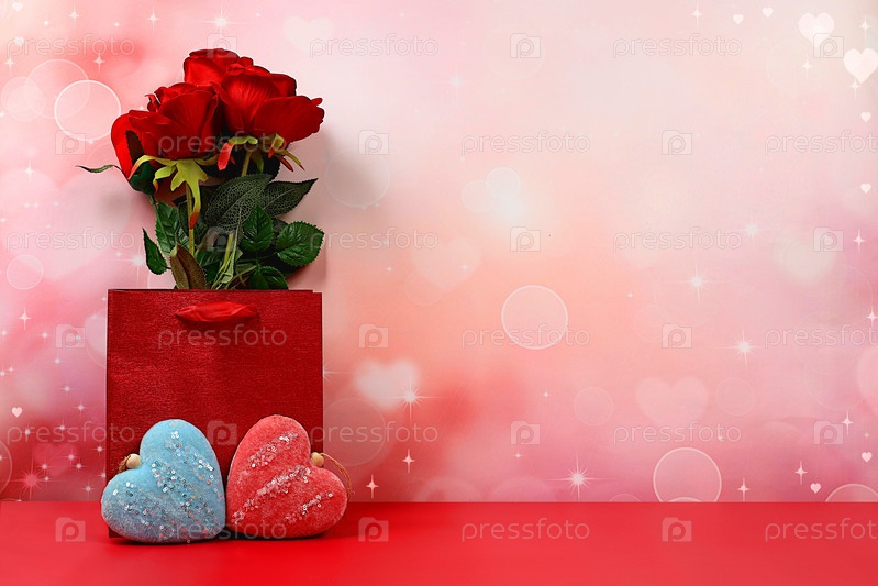 Концепция ко Дню святого Валентина или Женскому дню, Дню матери, баннеру. Поздравительная открытка, розы, сердечки и подарочные коробки на красном фоне, с праздником, поздравления с днем рождения