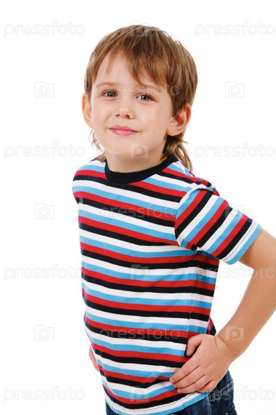 Портрет улыбающегося мальчика, смотрящего в камеру на белом фоне