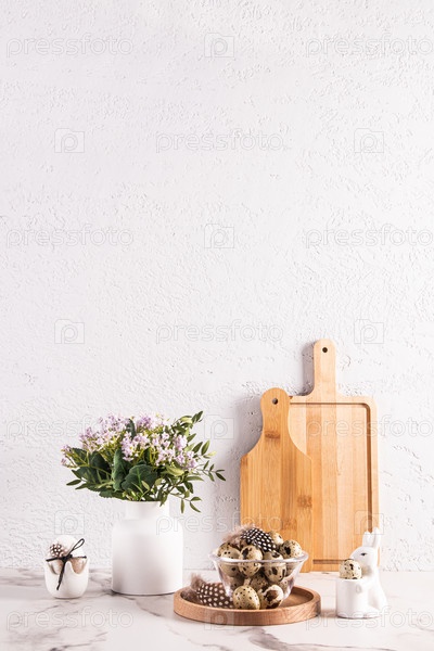 Стильный вертикальный кухонный фон для пасхального праздника с местом для текста. Традиционные угощения и украшения кухонных столешниц. Передний план