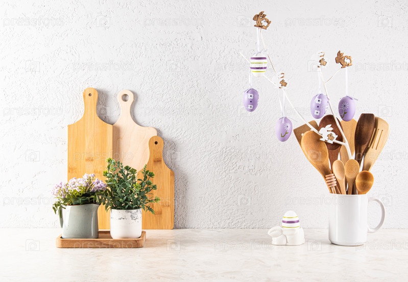 Украшаем кухонную столешницу к празднику Пасхи. Кухонная деревянная посуда, растения в горшках, ветка с сиреневыми яйцами. Передний план. Эко стиль