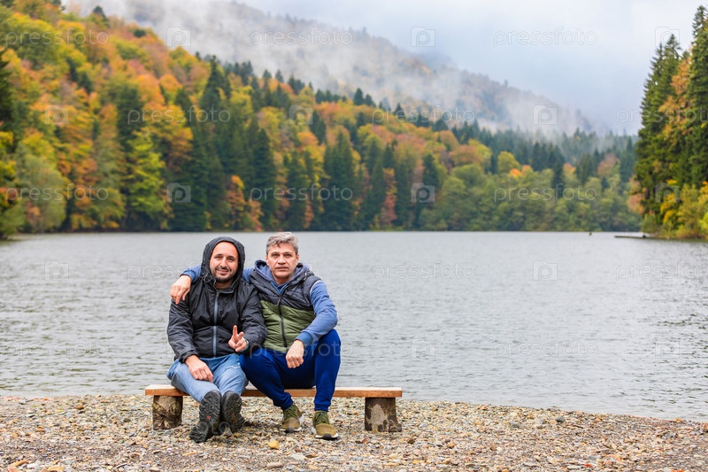 Осенний пейзаж озера в горах становится местом уединения для двоих мужчин, наслаждающихся прекрасным видом и спокойствием природы