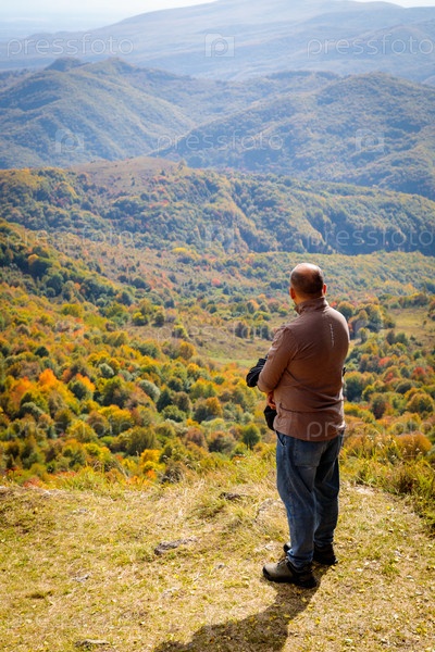 С высоты священного пика мужчина наслаждается умиротворяющими горными пейзажами, любуясь захватывающим дух видом. Безмятежная атмосфера и нетронутая красота природы создают ощущение чуда и внутреннего спокойствия