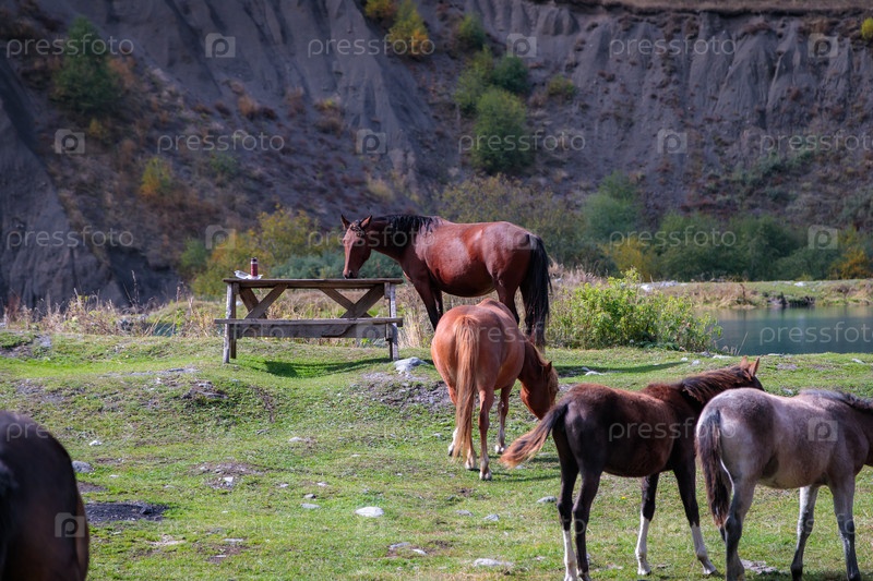 Величественные дикие лошади свободно бегают среди горных вершин, олицетворяя силу и красоту дикой природы