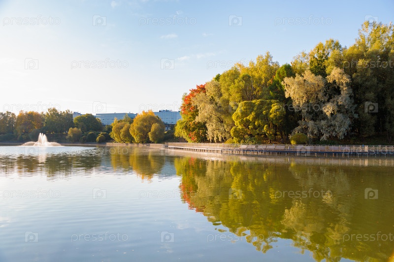Завораживающий вид на пруд осеннего городского парка поражает своей красотой и спокойствием