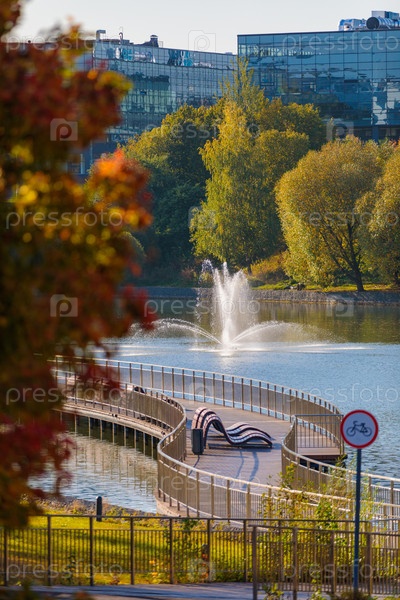 Фонтан на пруду в осеннем парке создает волшебную атмосферу спокойствия