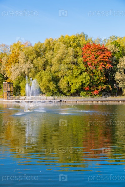 Волшебная красота осеннего парка с фонтаном на пруду дарит тишину и покой