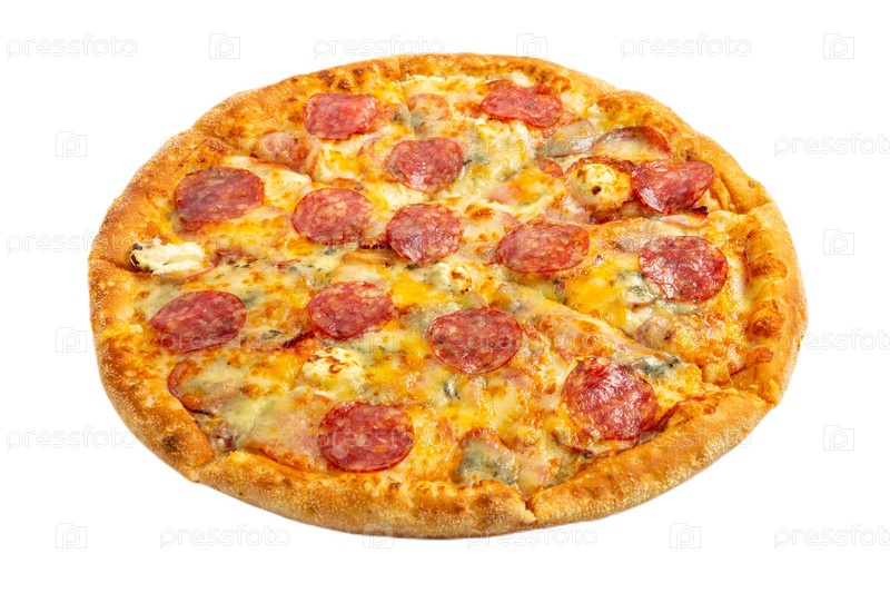 Вкусная классическая итальянская пицца Пепперони с сосисками и сыром моцарелла. Свежая итальянская классическая оригинальная пицца пепперони изолирована на белом фоне