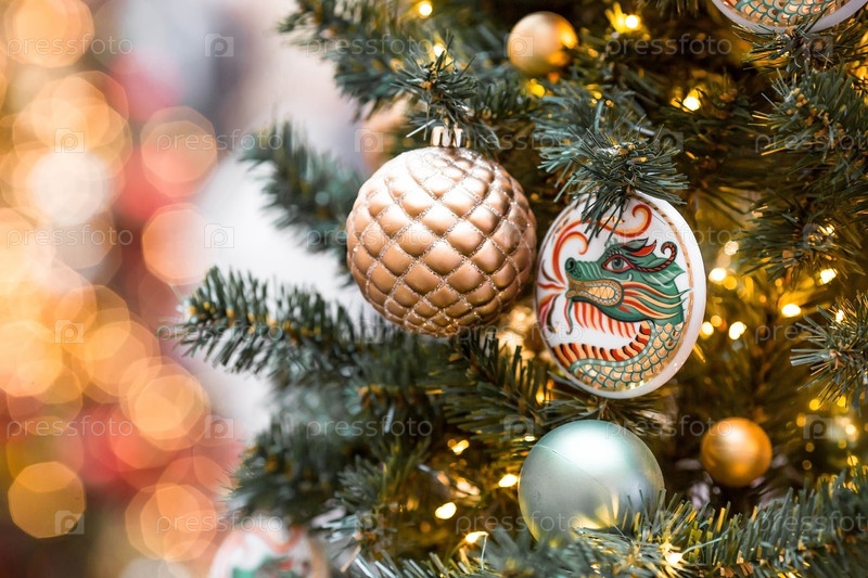 Год Дракона. Красивые фарфоровые игрушки в виде дракона на праздничной новогодней елке в магазине ГУМ в Москве. Крупный план. Китайский Новый год 2024
