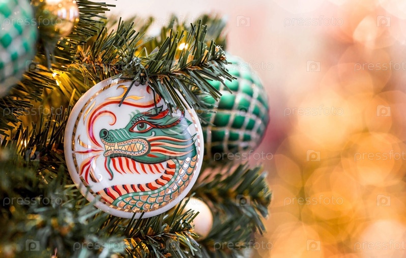 Год Дракона. Красивые фарфоровые игрушки в виде дракона на праздничной новогодней елке в магазине ГУМ в Москве. Крупный план. Китайский Новый год 2024