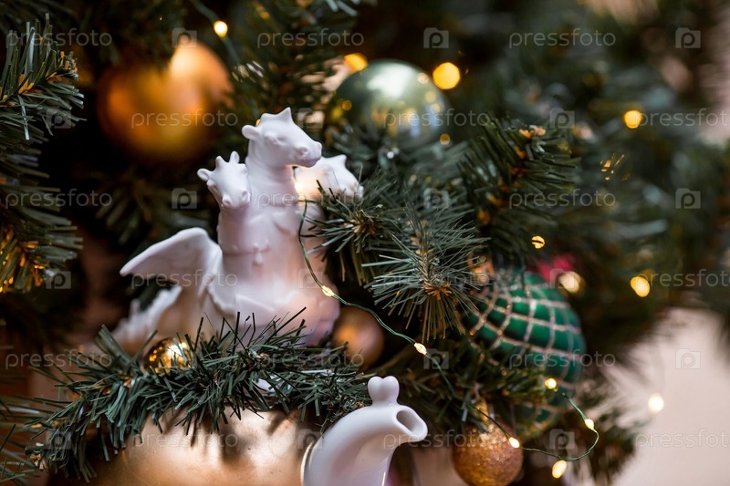 Год Дракона. Красивые фарфоровые игрушки в виде дракона на праздничной новогодней елке в магазине ГУМ в Москве. Крупный план. Китайский Новый год 2024