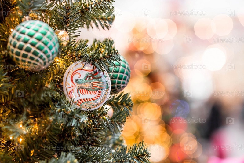 Год Дракона. Красивые фарфоровые игрушки в виде дракона на праздничной новогодней елке в магазине ГУМ в Москве. Крупный план. Китайский Новый год 2024