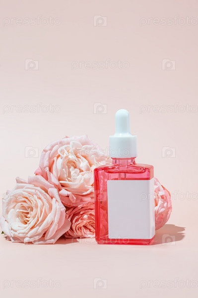 Брендинговый макет стеклянной бутылки-капельницы. Косметическая пипетка. Модный розовый фон. Концепция органической и косметической косметики. Резкий солнечный свет