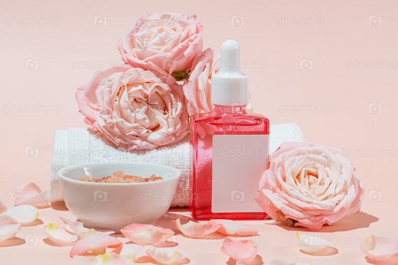 Сыворотка для лица и тела в бутылке на розовом фоне с миской гималайской соли. Концепция косметики и спа по уходу за розовой водой. Здоровье и красота. Копировать пространство