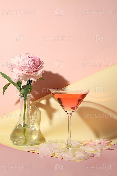 Современный натюрморт с розовым мартини, алкогольным коктейлем и цветами пиона на элегантном современном фоне, минимальная концепция бара и праздничной вечеринки, кафе, рекламный баннер, выборочный фокус, место для текста