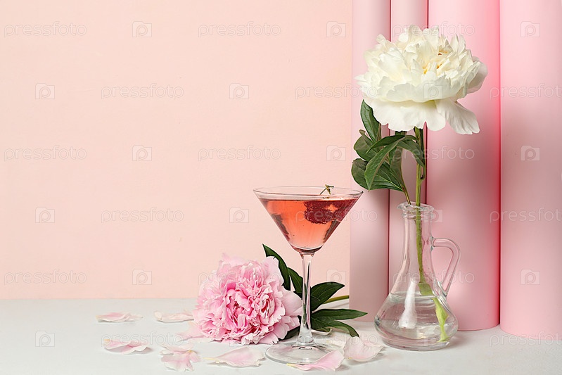 Современный натюрморт с розовым мартини, алкогольным коктейлем и цветами пиона на элегантном современном фоне, минимальная концепция бара и праздничной вечеринки, кафе, рекламный баннер, выборочный фокус, место для текста