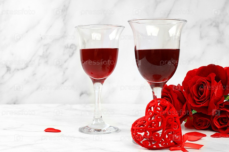 Поздравительная открытка ко Дню святого Валентина или Женскому дню, баннер, сердечки, розы и красное вино на бетонном фоне. Поздравления с днем рождения, свадьбой или женским днем,