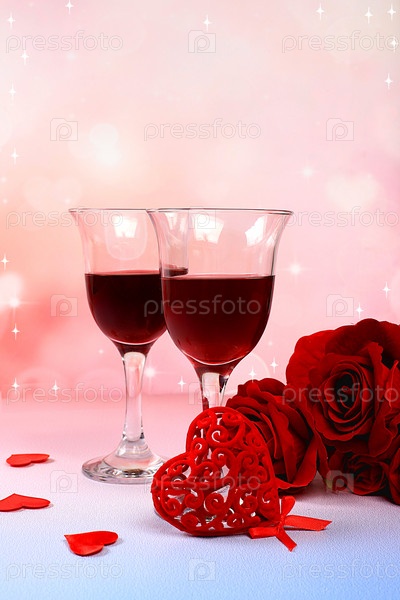 Поздравительная открытка ко Дню святого Валентина или Женскому дню, баннер, сердечки, розы и красное вино на розовом фоне. Поздравления с днем рождения, свадьбой или женским днем,
