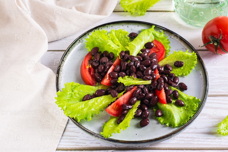 Вегетарианский салат из черной фасоли, помидоров и салата на тарелке