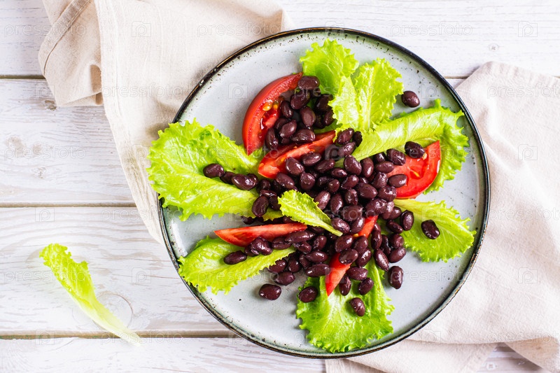Крупный план аппетитной черной фасоли, помидоров и салата на тарелке на столе