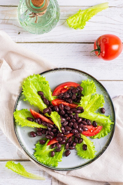 Вегетарианский салат из черной фасоли, помидоров и салата на тарелке и вертикальном виде
