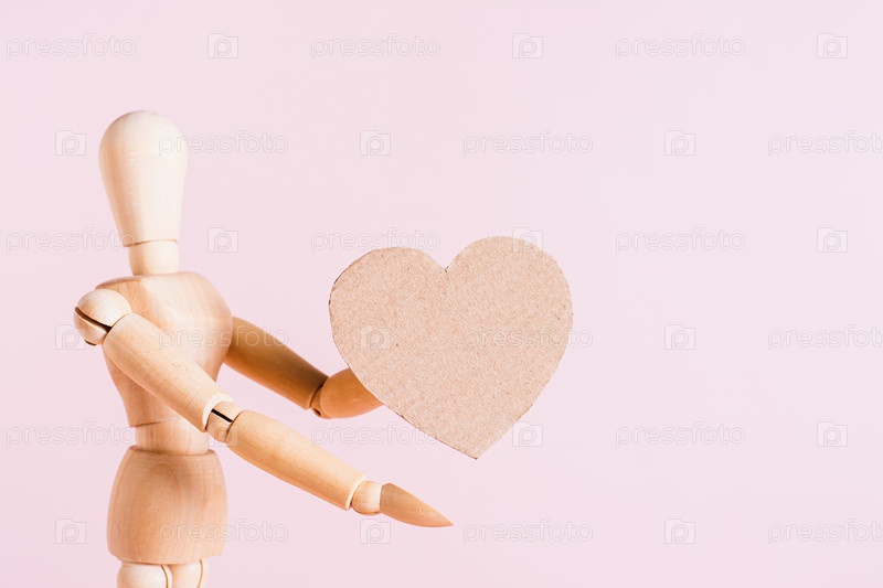 Деревянный человечек протягивает в руке картонное сердце на розовом фоне