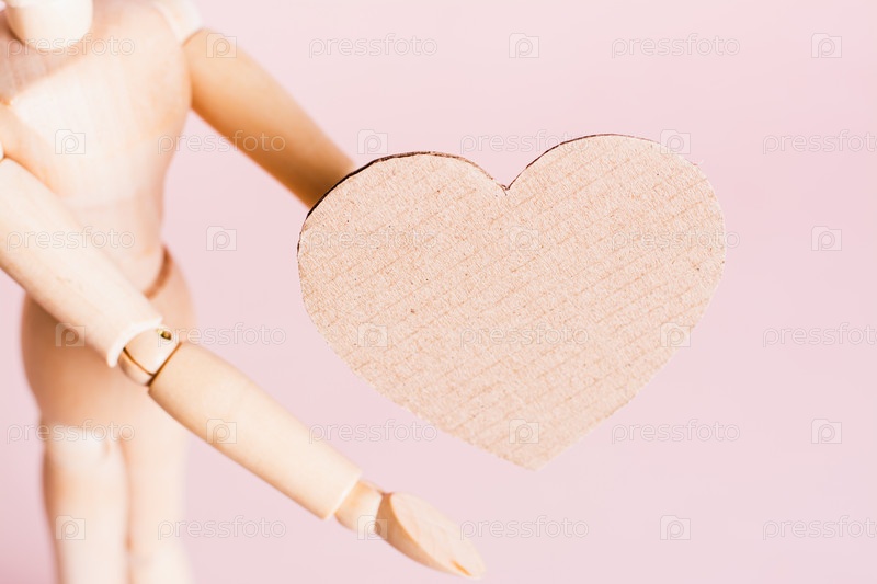 Ремесло картонное сердце в деревянных руках на розовом фоне