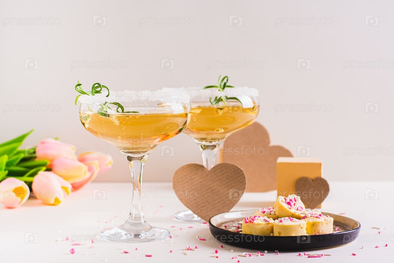 Сладкие коктейли с розмарином в стаканах и конфетными сердечками на тарелке ко Дню Святого Валентина