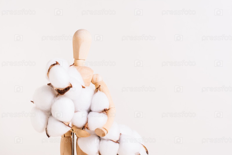 Концепция комфорта и спокойствия: деревянный человек держит ветку хлопка
