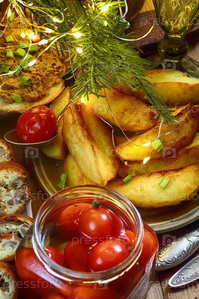 Праздничный стол с мясным пирогом,паштетом,картофелем и вином