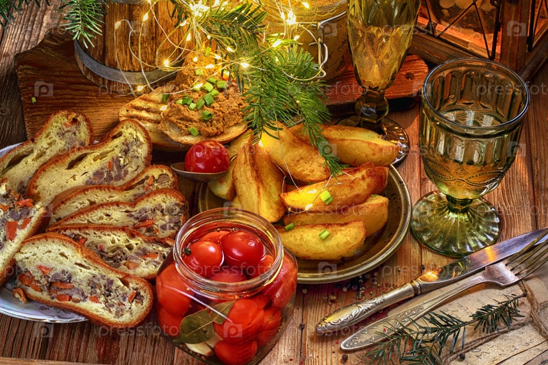 Праздничный стол с мясным пирогом,паштетом,картофелем и вином