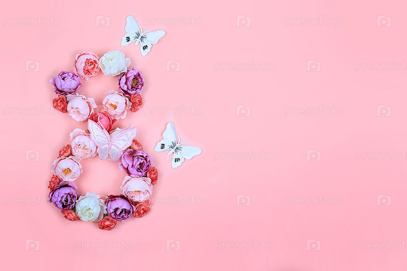 Цветочный номер восемь с бабочками на розовом фоне. Концепция ко Дню святого Валентина или Женскому дню, Дню матери, баннеру, поздравления любимому человеку с праздником, днем рождения, минимальный современный дизайн, выборочный фокус