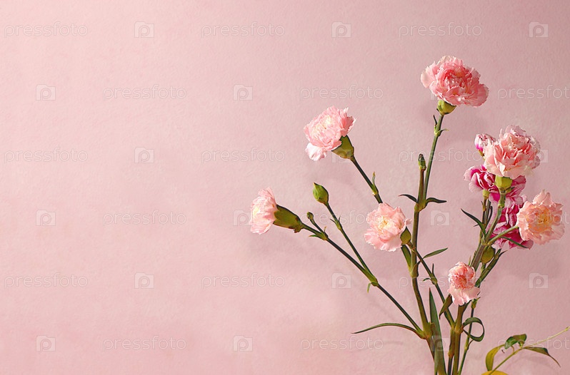 Цветочная композиция с гвоздиками на розовом фоне. Концепция ко Дню святого Валентина или Женскому дню, Дню матери, баннеру, поздравлению любимого человека с праздником, днем рождения, минимальный современный дизайн