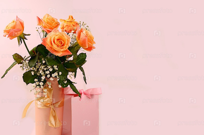 Цветочная композиция с чайными розами и подарочной коробкой. Концепция Дня святого Валентина или Женского дня, Дня матери, баннера, поздравления любимому человеку с праздником, днем рождения, минимальный современный дизайн, избирательный фокус