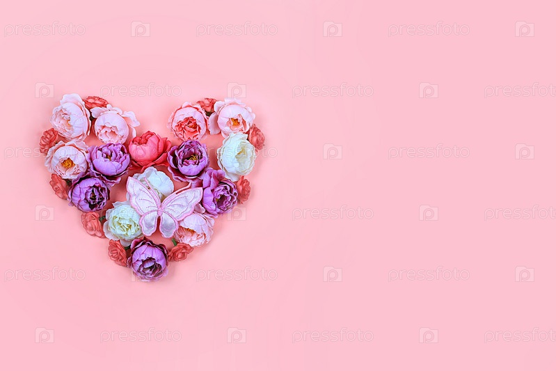Цветочное сердце с бабочками на розовом фоне. Концепция ко Дню святого Валентина или Женскому дню, Дню матери, баннеру, поздравления любимому человеку с праздником, днем рождения, минимальный современный дизайн, избирательный фокус